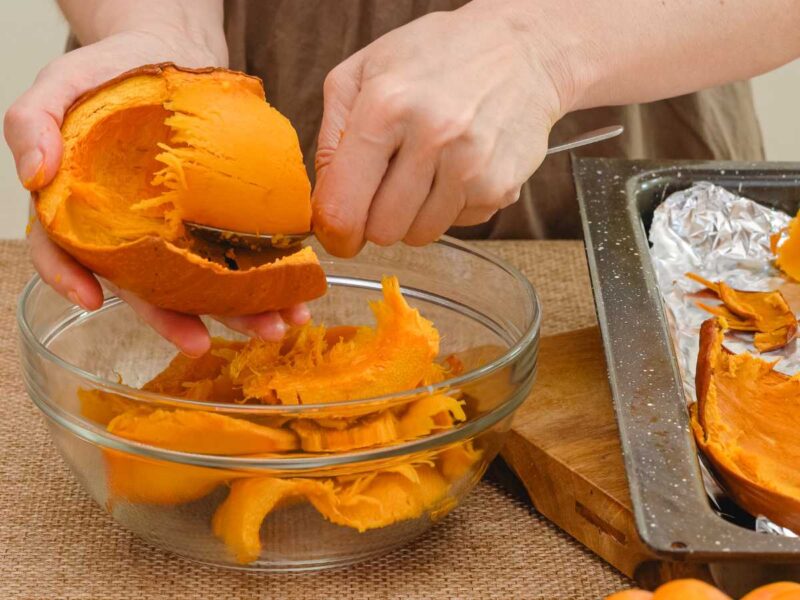 - Una vez lista, deja enfriar los trozos lo suficiente para manejarlos y retira la piel con un cuchillo o simplemente con los dedos. La calabaza debe estar muy blanda y fácil de triturar.