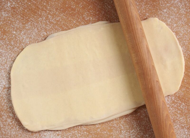 - Desenrolla la masa de hojaldre sobre una superficie plana y ligeramente enharinada.