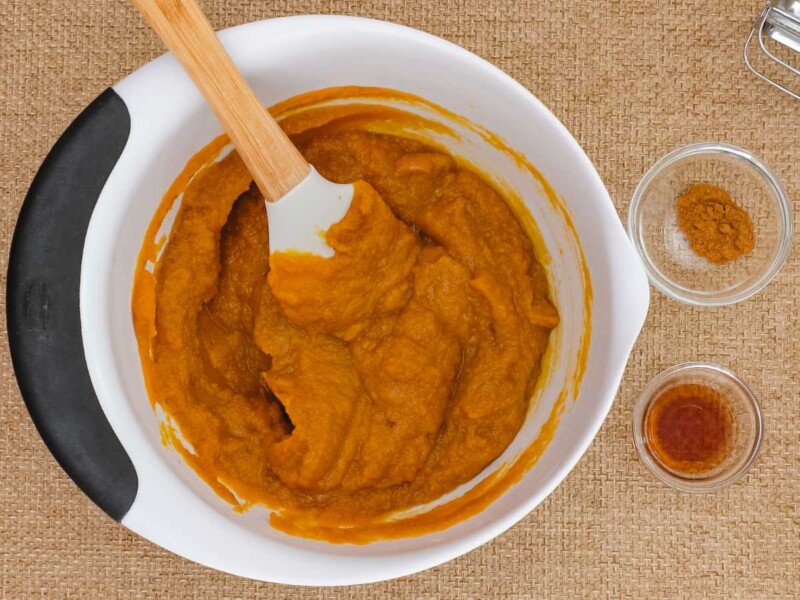 - En un bol, mezcla los 300 g de puré de calabaza con el azúcar moreno, la canela y la nuez moscada (opcional).