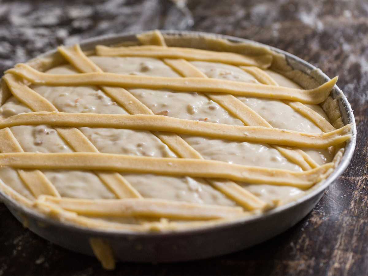 - Coloca las tiras de masa cruzadas sobre la superficie de la pastiera, formando un patrón de enrejado.