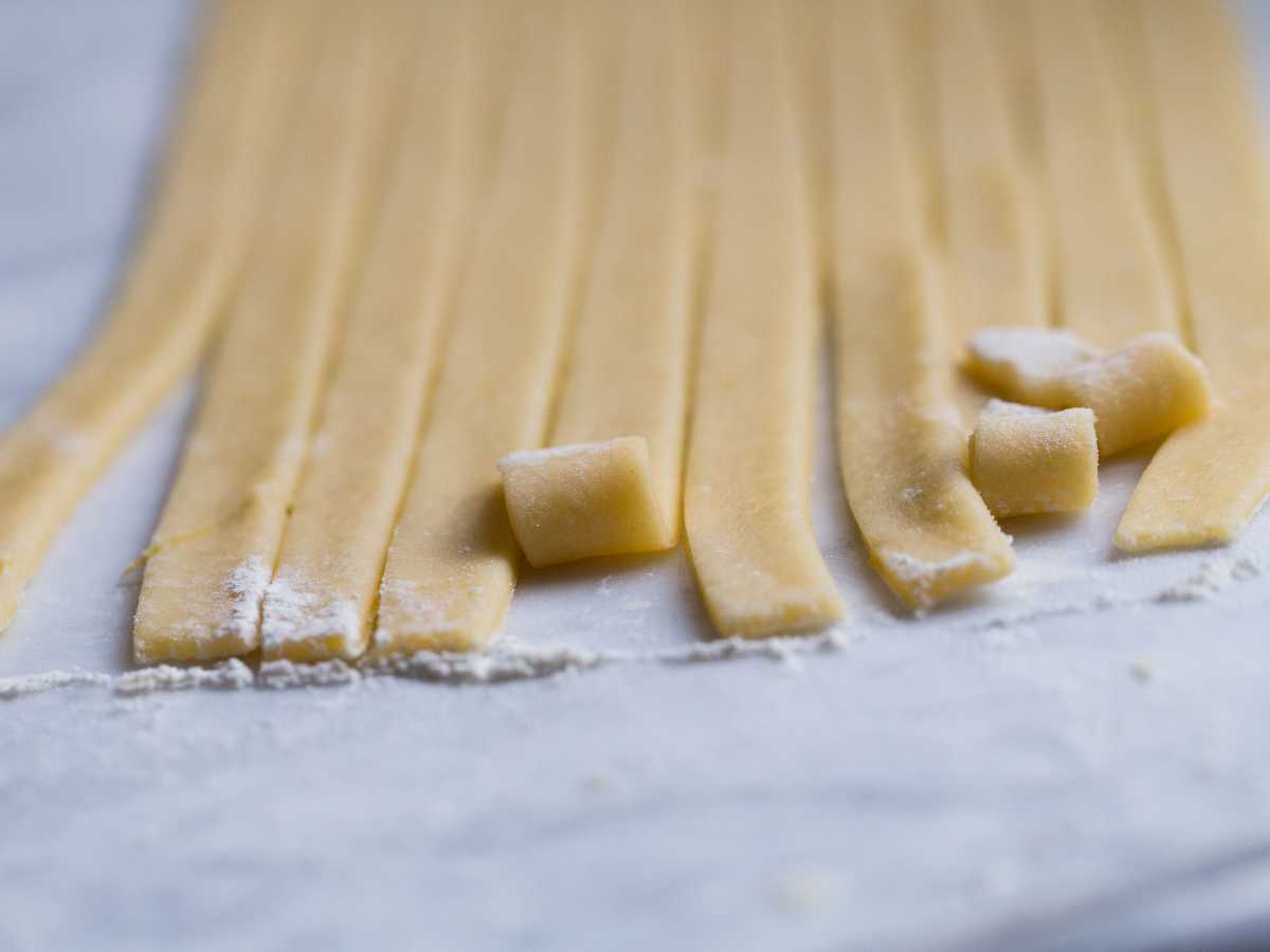 - Con un cuchillo afilado o una rueda de corte, corta tiras de masa de aproximadamente 1 cm de ancho y del largo suficiente para cubrir la superficie de la pastiera en una rejilla.