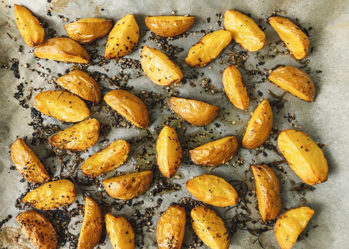 - Ponedlas en una fuente de horno, sin amontonarlas demasiado, y agregad bastante aceite, y si preferís alguna hierba aromática como el romero, ajo en polvo y pimienta, etc. Cocinad hasta que estén doradas, recordando de darlas vuelta a mitad de la cocción.