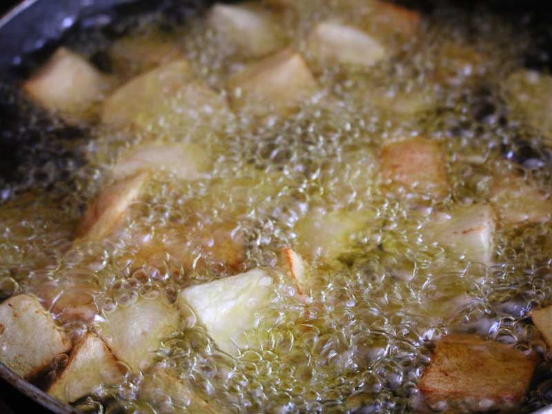 - Freímos primero con aceite a temperatura media. Cuando las patatas estén hechas, subimos la temperatura y dejamos que se doren.