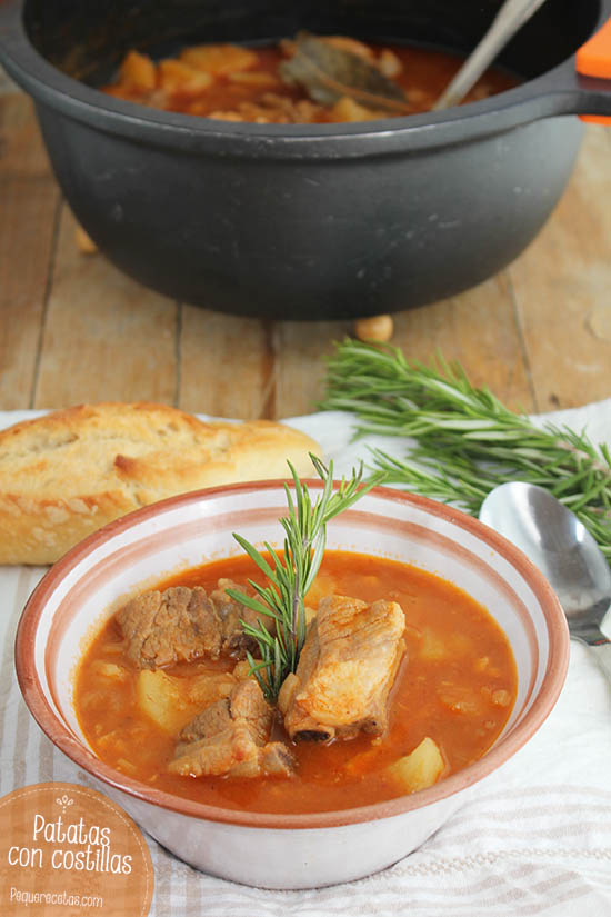 Hoy os traemos un plato muy tradicional: patatas con costillas, un guiso económico y sencillo de preparar, perfecto para los días de frío, similar en la elaboración a las patatas a la riojana que os enseñamos hace unas semanas. Y es que las patatas dan mucho juego y con el precio que tienen, tenemos que aprovechar todas sus posibilidades en la cocina.