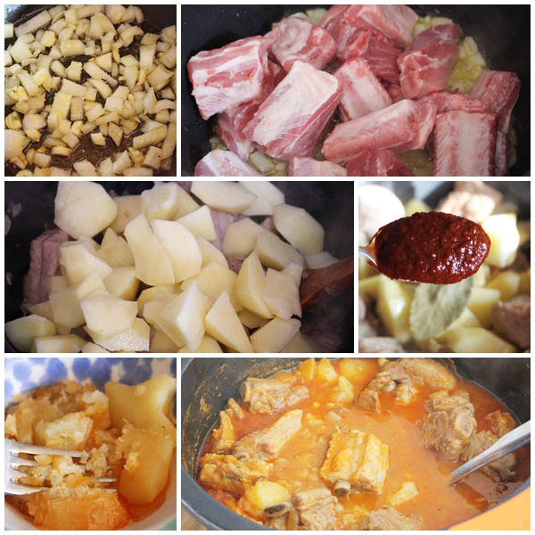 En una cazuela ponemos un poco de aceite de oliva virgen extra y añadimos los ajos y la cebolla, pelados y picados finamente. Pochamos a fuego suave. Incorporamos las costillas, la hoja de laurel, un poco de sal y dejamos que se cocinen las costillas hasta que comiencen a dorarse. Añadimos las patatas, que pelamos y cortamos en trozos “chascándolas”, rehogamos un poco y añadimos la carne de pimiento choricero y el vino blanco. Mareamos un par de minutos y cubrimos con agua. En el momento que comience a hervir, bajamos el fuego y dejamos que se cocine a fuego suave unos 20 minutos. De vez en cuando moveremos la cazuela. Antes de servir, para que el caldo se quede más trabado, sacamos dos o tres trozos de patata, los chafamos con el tenedor y volvemos a incorporar a la cazuela, mezclando bien.
