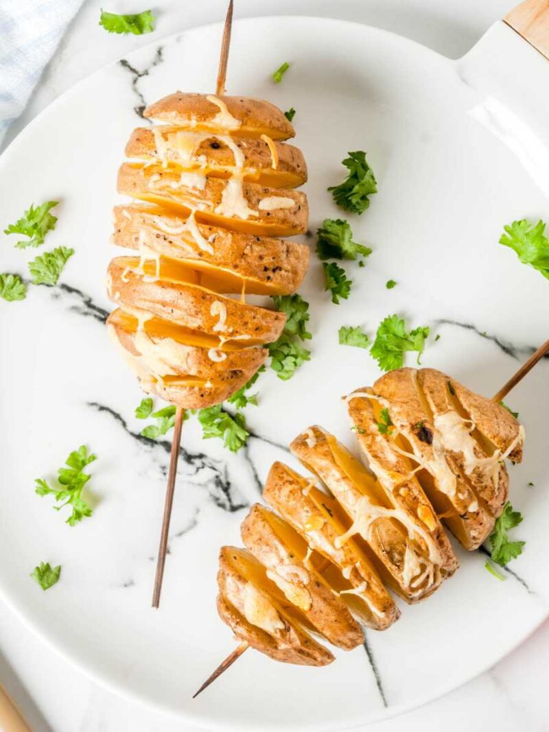 - Lavamos bien las patatas y las ensartamos con un palillo de brocheta.