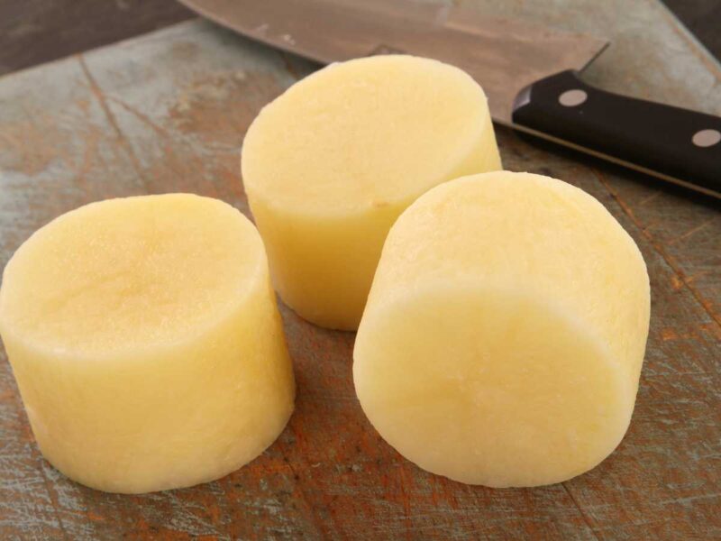 - Pelar y cortar las patatas: Pela las patatas y córtalas en cilindros gruesos (aproximadamente de 5 cm de alto). Puedes hacer esto cortando los extremos redondeados para que tengan una forma uniforme. Es importante que los cortes sean regulares para que se cocinen de manera uniforme.
