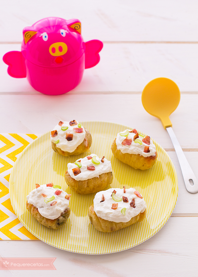 Me gusta presentarlas con un poquito de crema agria por encima, unos trocitos de bacon y unos trocitos de cebolleta, un bocado realmente apetitoso.