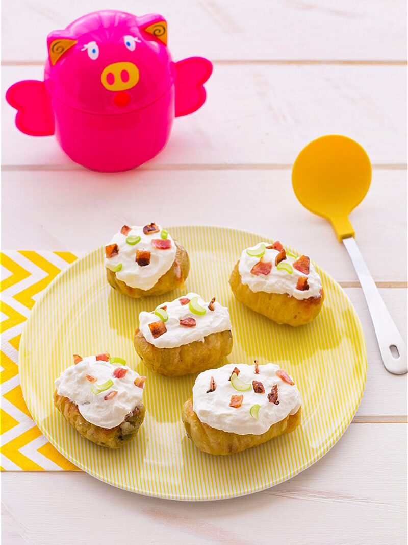 En nuestro caso una vez pierdan parte del calor acompañamos las patatas Hasselback con la crema agria, unos trocitos de bacon fritos y unos trocitos de cebolleta fresca.