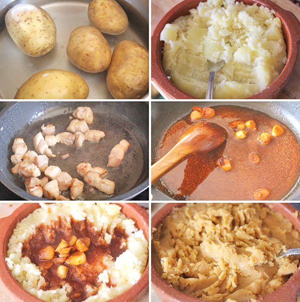 El proceso para prepararlas comienza con la cocción de las patatas, que luego se machacan hasta obtener un puré. Luego las patatas se “menean” o “revuelcan” con pimentón (dulce o picante, según el gusto), ajo frito y aceite de oliva, lo que le da su característico color anaranjado. El toque final lo aportan los torreznos o la panceta crujiente, que se sirven por encima, creando un contraste de texturas entre lo cremoso del puré y lo crujiente del cerdo.