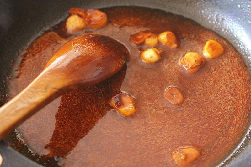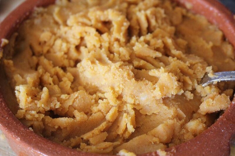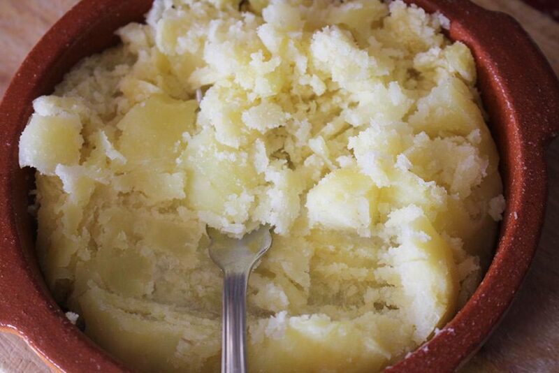 - Las pelamos, las ponemos en una cazuela de barro, y con un tenedor o pisapatatas las trituramos.