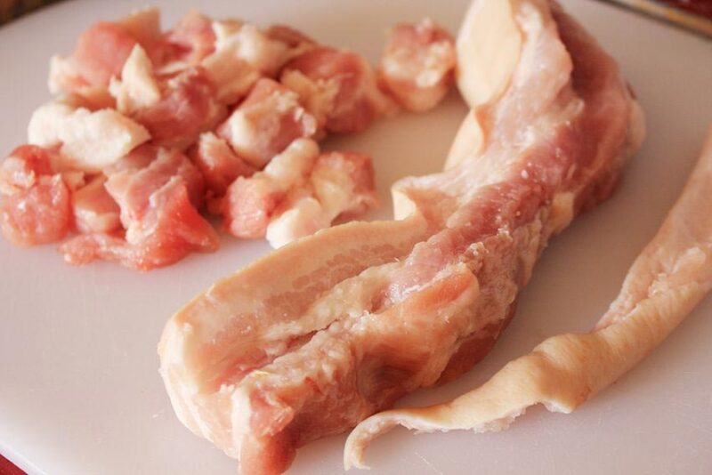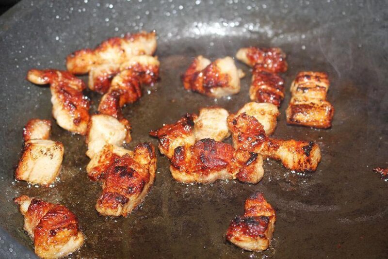 - Por otro lado, cortamos en trozos la panceta y cocinamos hasta que esté bien dorada, también podéis usar torreznos.