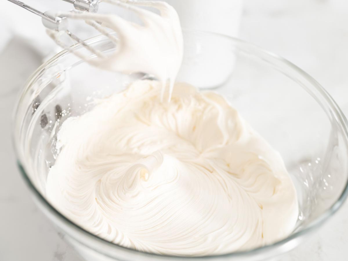 - Cuando esté montada y firme añadimos el queso crema y el extracto de vainilla y seguimos batiendo hasta que se integre todo.
