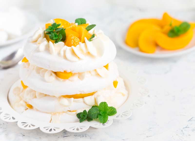 Preparamos la base del merengue con la receta anterior y preparamos una crema con nata montada y le agregamos un poco del líquido del melocotón en almíbar. Montamos los 3 pisos de la Pavlova rellenando cada uno con la crema, el melocotón en almíbar cortado en trozos, y decoramos con hojas de menta.