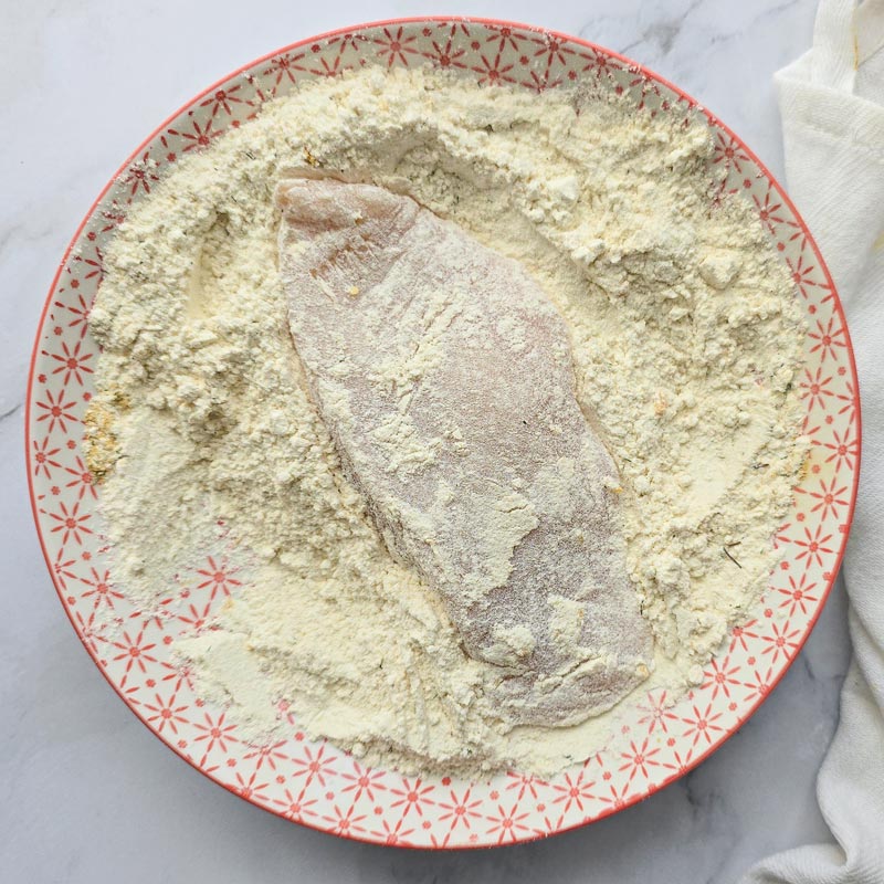 - Pasa cada trozo de pollo primero por la harina, luego por el huevo batido.