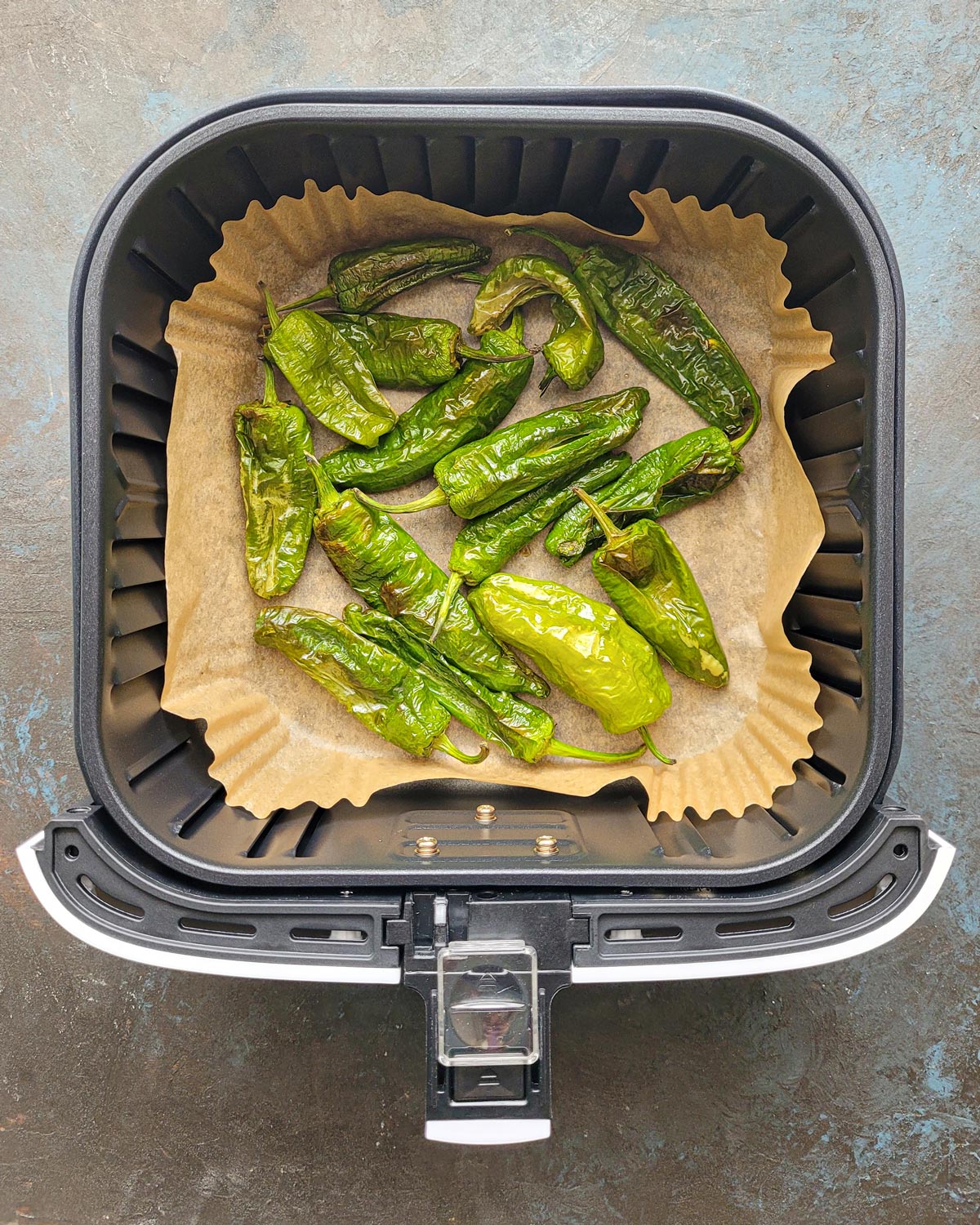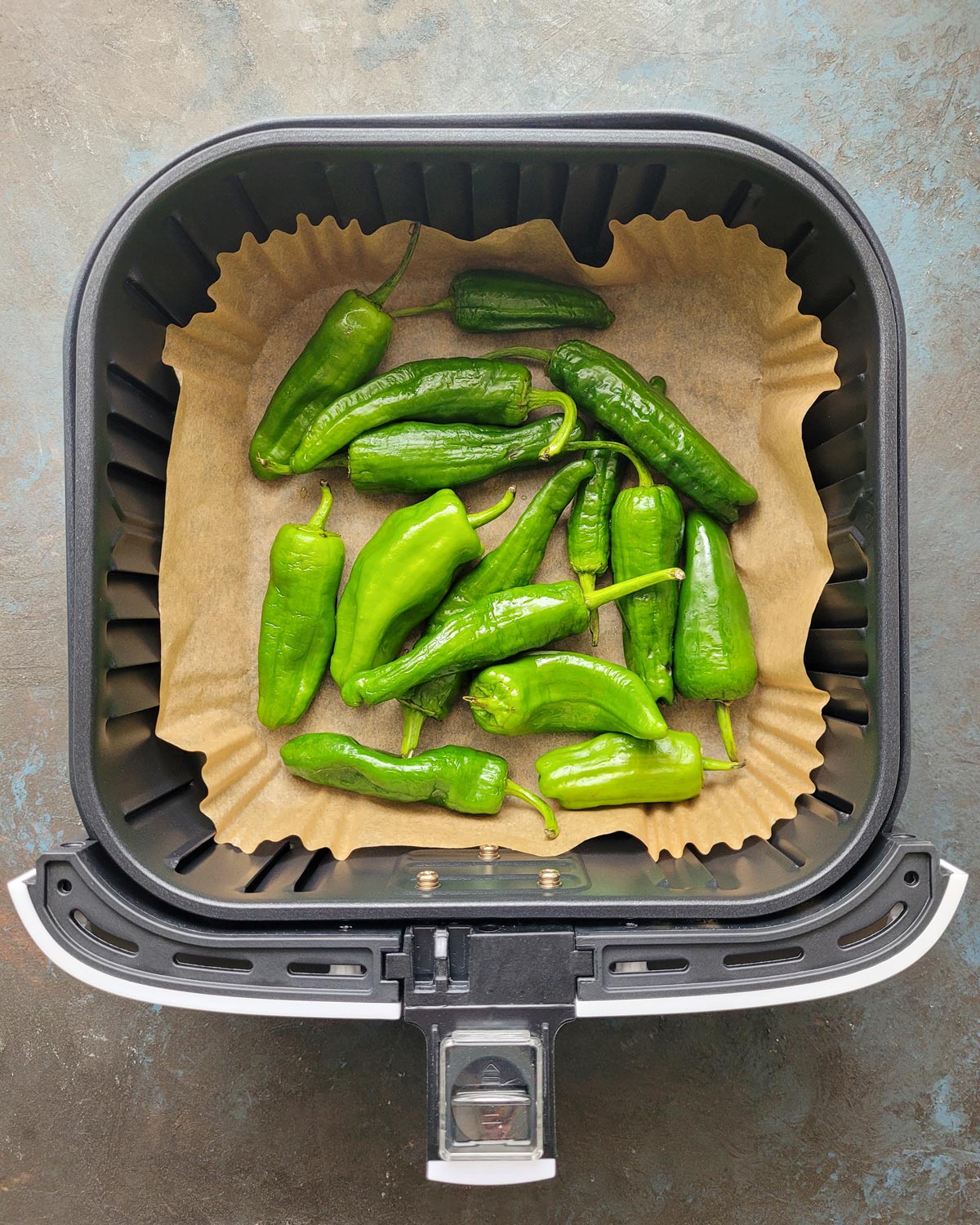 - Coloca los pimientos de Padrón en la cesta de la air fryer sobre el papel, en una sola capa. Esto permitirá que se cocinen de manera uniforme.