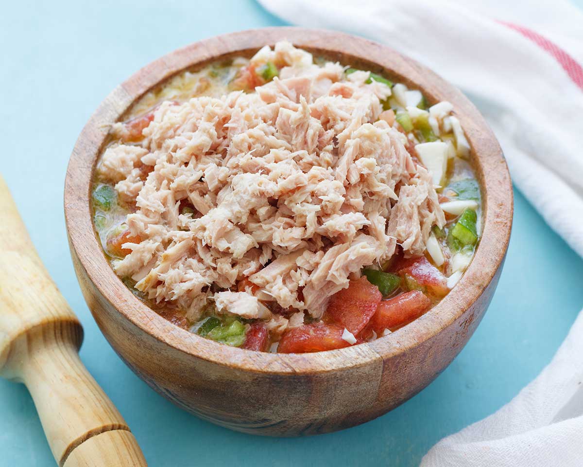 - Escurrimos muy bien el atún y lo añadimos a la pipirrana.