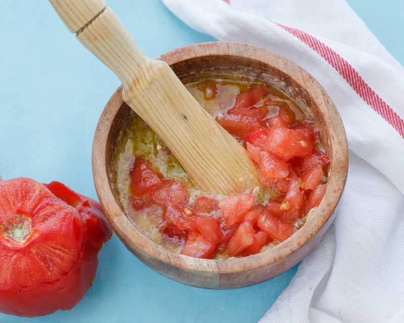 - Pelamos los tomates y los cortamos en cubitos, añadiéndolos a la vinagreta, y teniendo cuidado de que el jugo del tomate caiga en la vinagreta, porque forma parte de la gracia de esta ensalada.