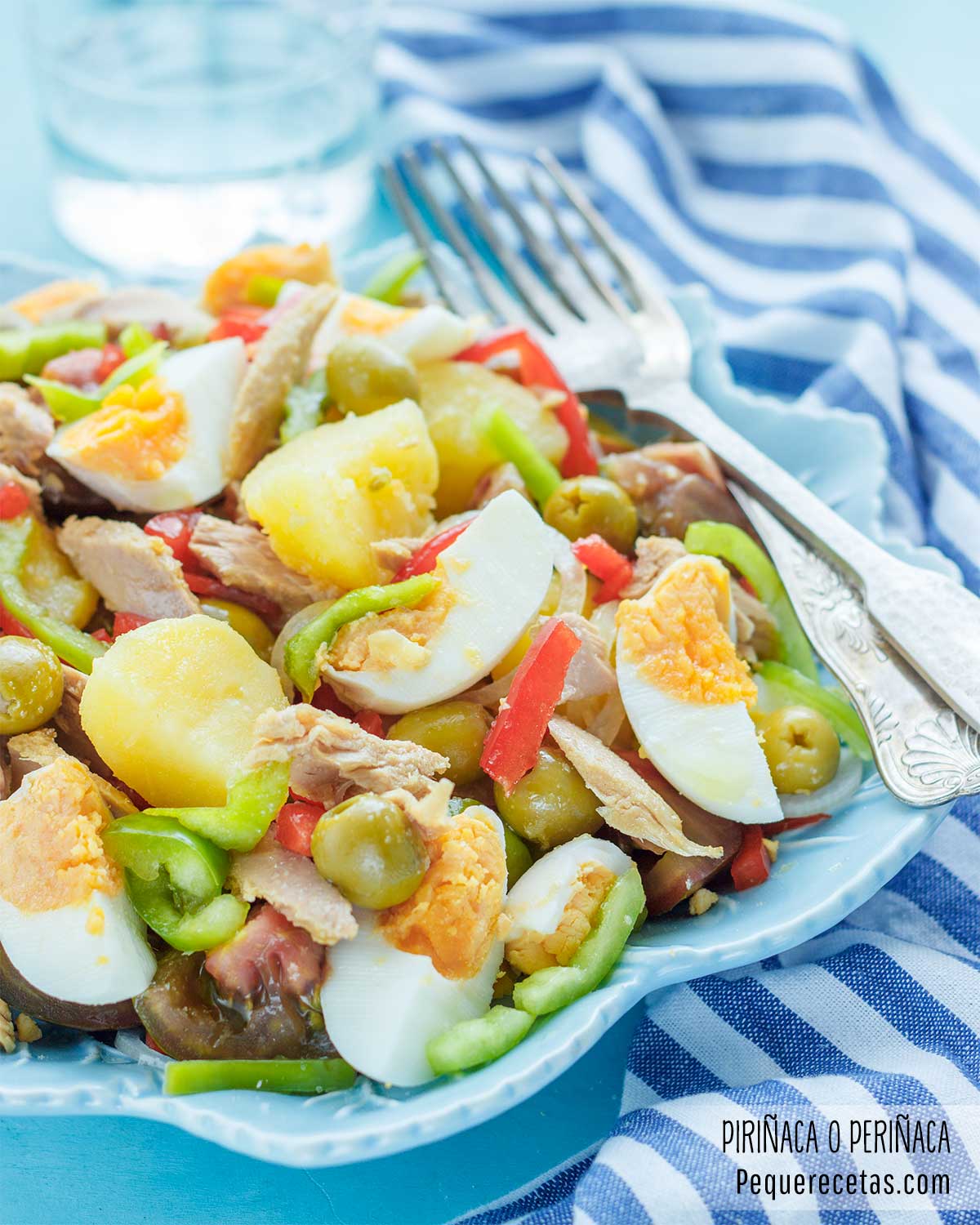 La piriñaca o periñaca es una ensalada muy completa, ya que al incorporar patatas, huevos, atún y vegetales incorpora todos los grupos de alimentos, por lo que puede ser perfecta para dejar preparada y consumirla al volver de la playa si quieres tener comidas preparadas, fáciles y sanas.
