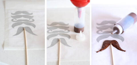 Colocamos la plantilla en la zona donde vayamos a trabajar (mejor una zona fría de la casa). Ponemos encima un papel de hornear, y un palito de brocheta en la parte central del bigote. Introducimos el chocolate en un biberón de repostería con ayuda de un embudo, o a una bolsa de congelación a la que cortaremos la puntita y vamos dibujando los bordes del bigote. A continuación rellenamos. Dejamos enfriar los bigotes a temperatura ambiente sin moverlos para nada.