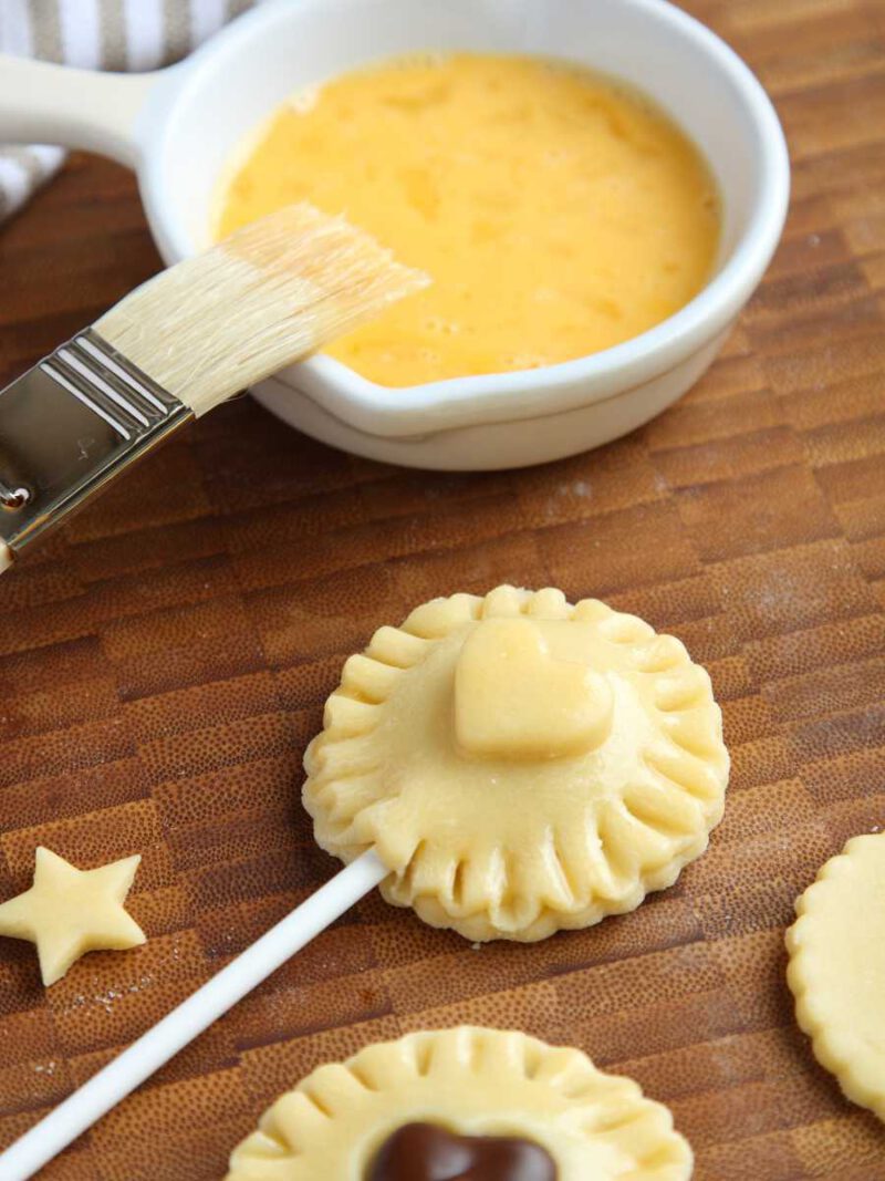 - Pinta las piruletas con huevo batido para que queden doradas y brillantes.