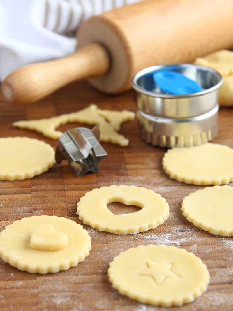 - Con la ayuda de un cortador de galletas circular o en forma de corazón, corta el hojaldre en círculos de unos 6-7 cm de diámetro. Necesitarás dos círculos por piruleta.
