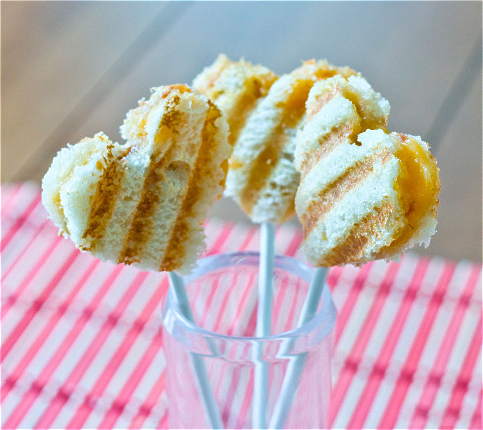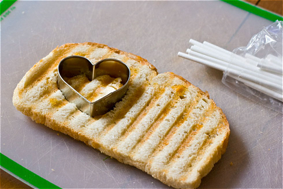 • Calienta los sándwiches en el grill unos 4 minutos hasta que aparezcan las marcas doradas de la parrilla. Retira del fuego e inmediatamente corta formas con los moldes de galletas (NOTA: Si estás usando un cortador de metal, éste se calienta muy rápidamente, así que ten cuidado de no quemarte los dedos) e inserta los palitos de piruleta.