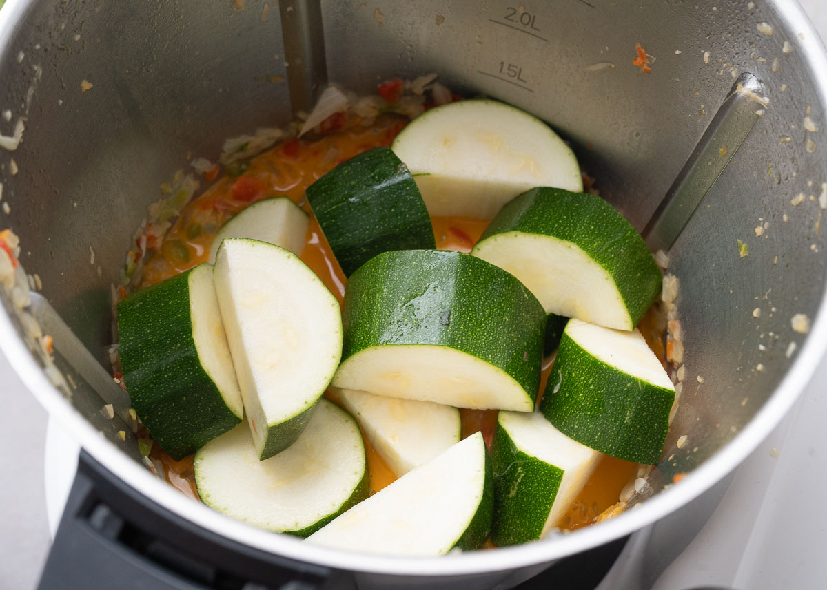 - Seguidamente añadimos el calabacín, cortado en rodajas grandes y sin pelar, y programamos durante 4 minutos en modo sofrito a 120°.