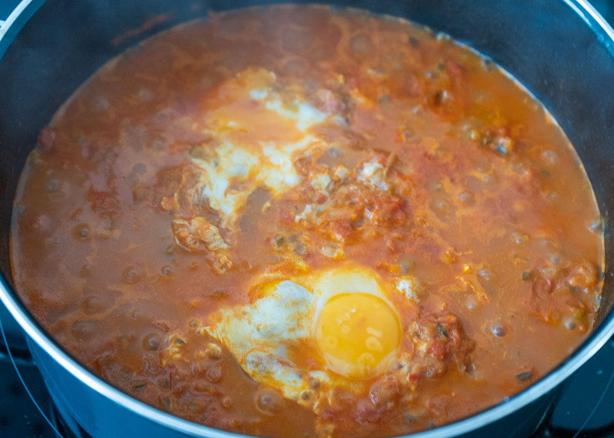 - Otra opción es escalfar los huevos en el propio pisto poniéndolo todo en una sartén a fuego medio, haciendo huecos en el pisto y cascando los huevos en los huecos. Añadimos un poco de sal en las yemas y tapamos la sartén durante unos 5 minutos hasta que estén a nuestro gusto.