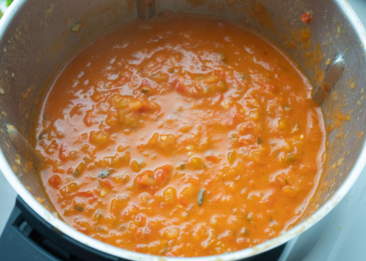 - Añadimos el tomate triturado y programamos durante 15 minutos a 120° en velocidad 2. Una vez pasado el tiempo probamos y añadimos algo de sal si fuera necesario.