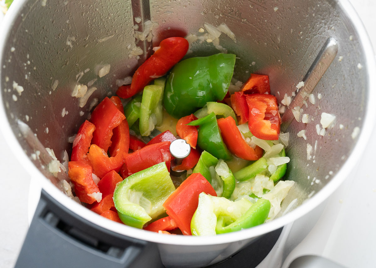 - Lavamos los pimientos, los descorazonamos y limpiamos y cortamos en trozos grandes. Los incorporamos a la jarra y Sofrprogramamos 4 minutos en modo sofrito a 120°.
