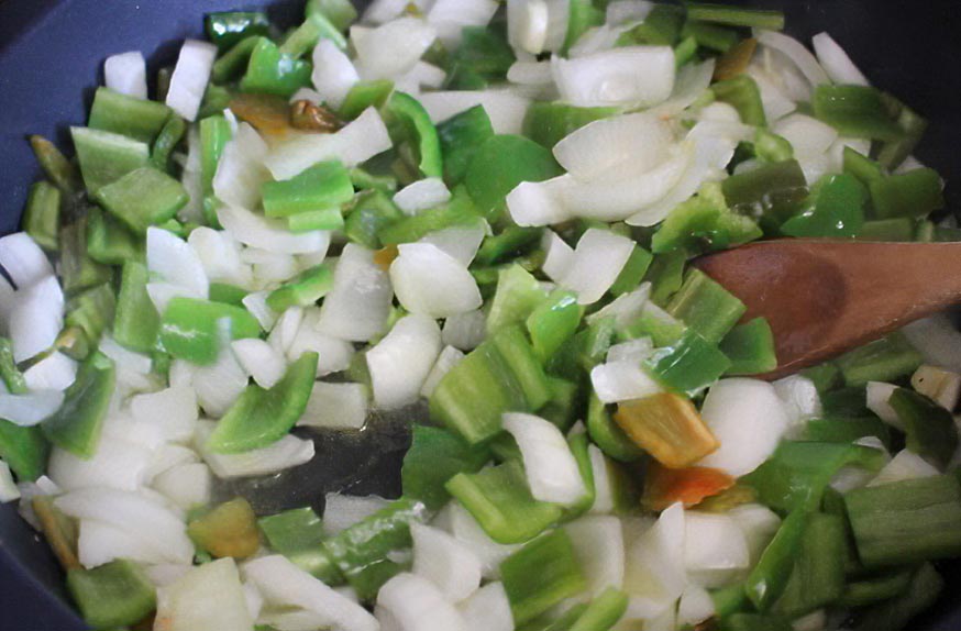 Rehogamos unos minutos e incorporamos los pimientos verdes.