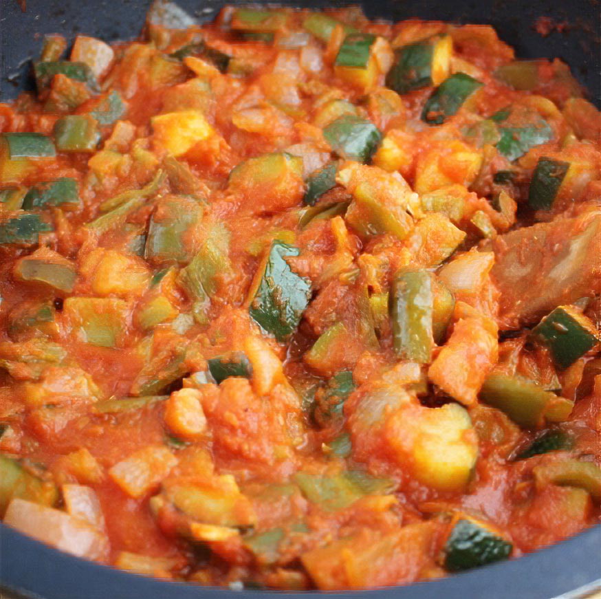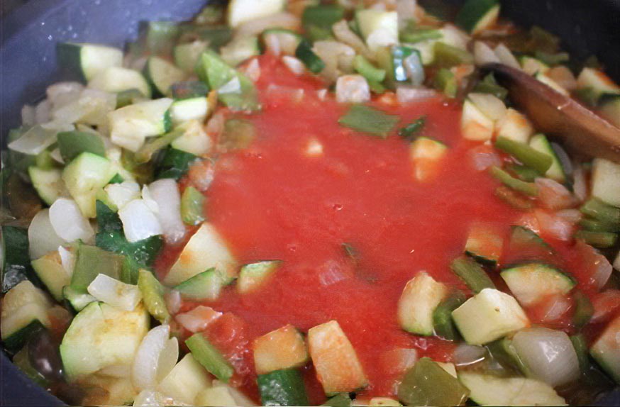 Sofreímos unos minutos y añadimos los calabacines, sin pelar y también cortados en dados.