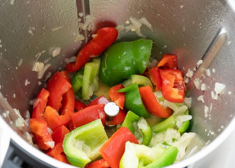 - Ponemos en el vaso los pimientos y la cebolla. Programamos 4 segundos, velocidad 4. Vaciamos y reservamos.