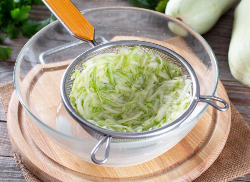 - Rallar el calabacín: Comienza rallando los calabacines usando un rallador de agujeros grandes. Coloca el calabacín rallado en un colador y espolvorea la sal por encima. Deja reposar durante unos 10 minutos para que el calabacín libere su agua.