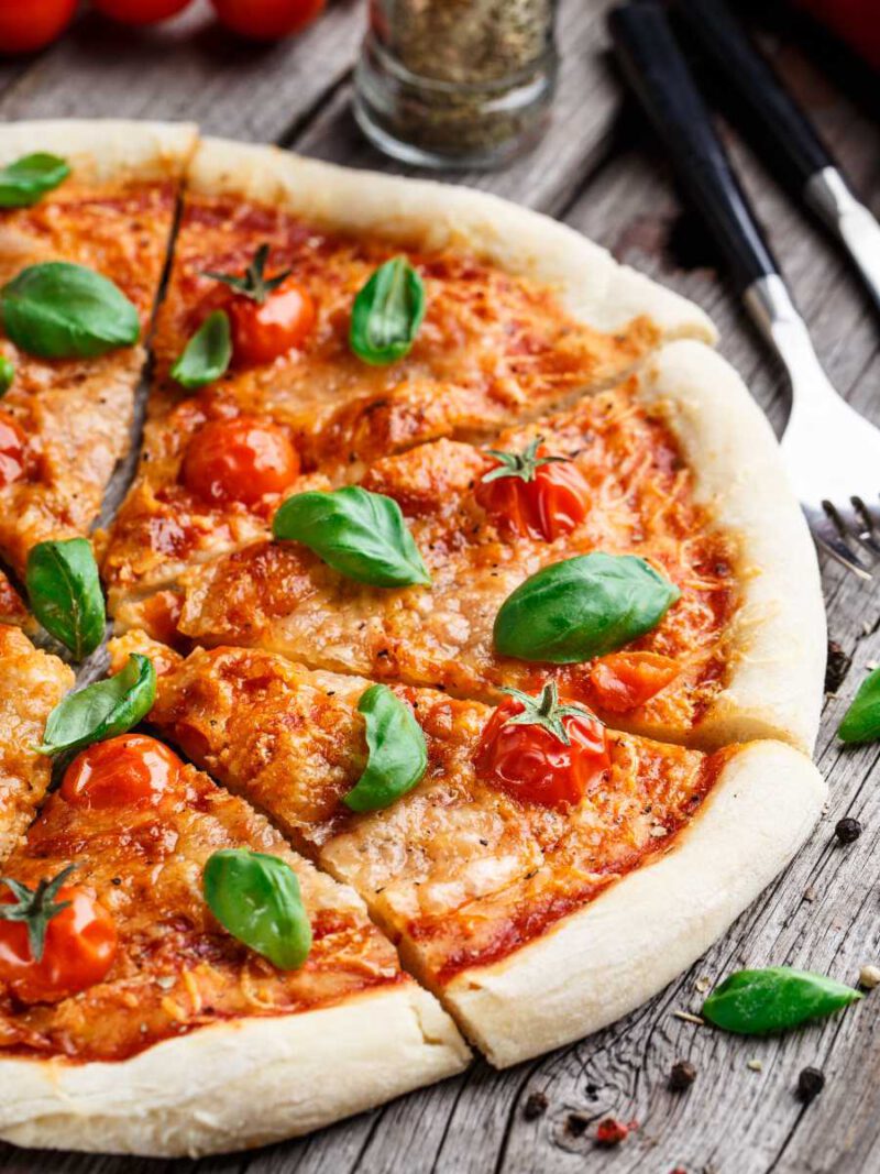 - Simplifica la receta usando solo la salsa de tomate, queso mozzarella, tomates cherry y hojas de albahaca fresca para disfrutar de una pizza Margarita casera perfecta.