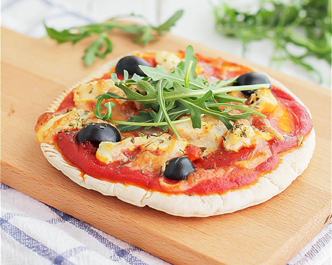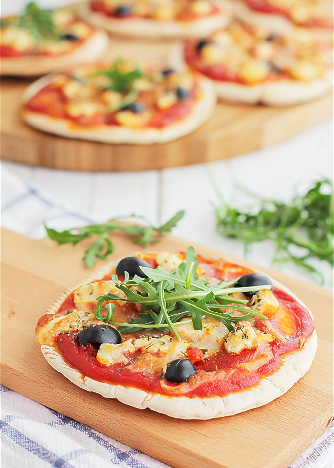 Acompaña estas pizzas en pan de pita con un poco de rúcula que le aportará frescor y color.