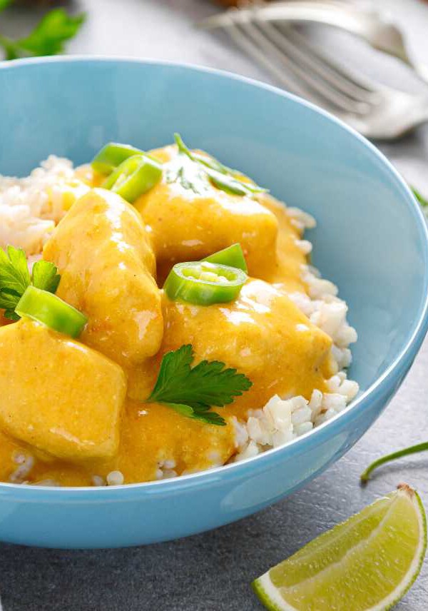 La receta original del pollo al curry lleva leche de coco, en lugar de nata, y las dos están deliciosas, por lo que te recomendamos que pruebes ambas para ver cuál te gusta más: