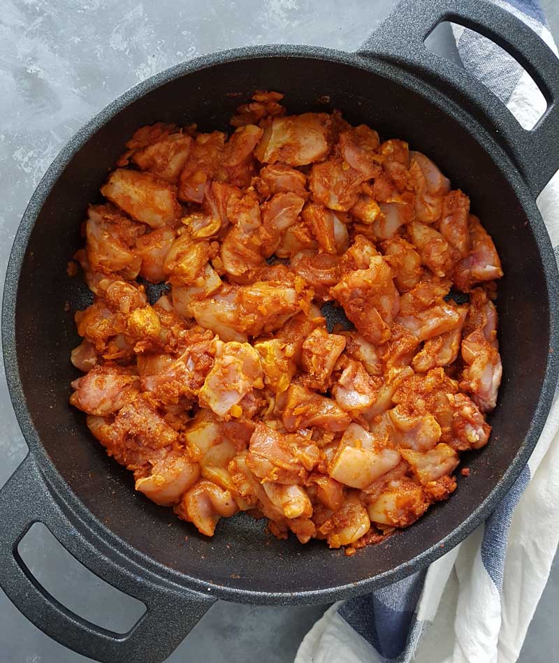 - Cortamos el pollo en cuadrados más o menos del mismo tamaño y salpimentamos. Nosotros hemos utilizado contramuslos deshuesados de pollo porque son más tiernos y jugosos que la pechuga de pollo.