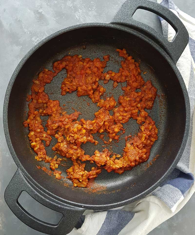 - Cuando comienza a ponerse dorado añadimos 5 cucharadas de tomate frito y 2 cucharadas de curry, y mezclamos bien.