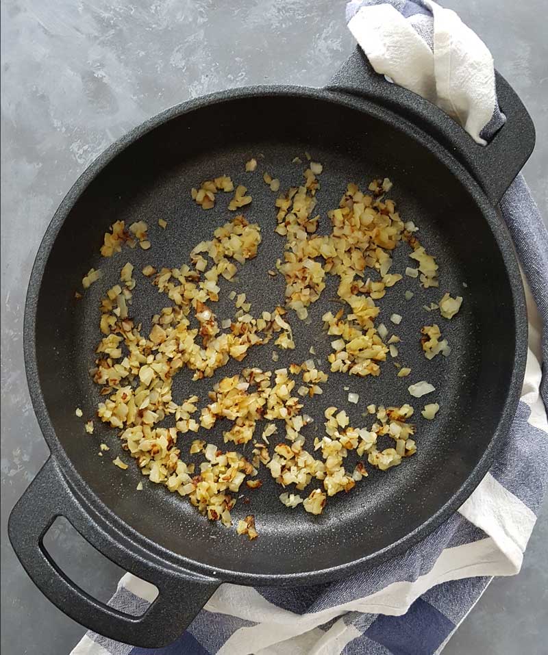 - Picamos la cebolla y el ajo muy finitos y los salteamos en una cazuela con un par de cucharadas de aceite de oliva.