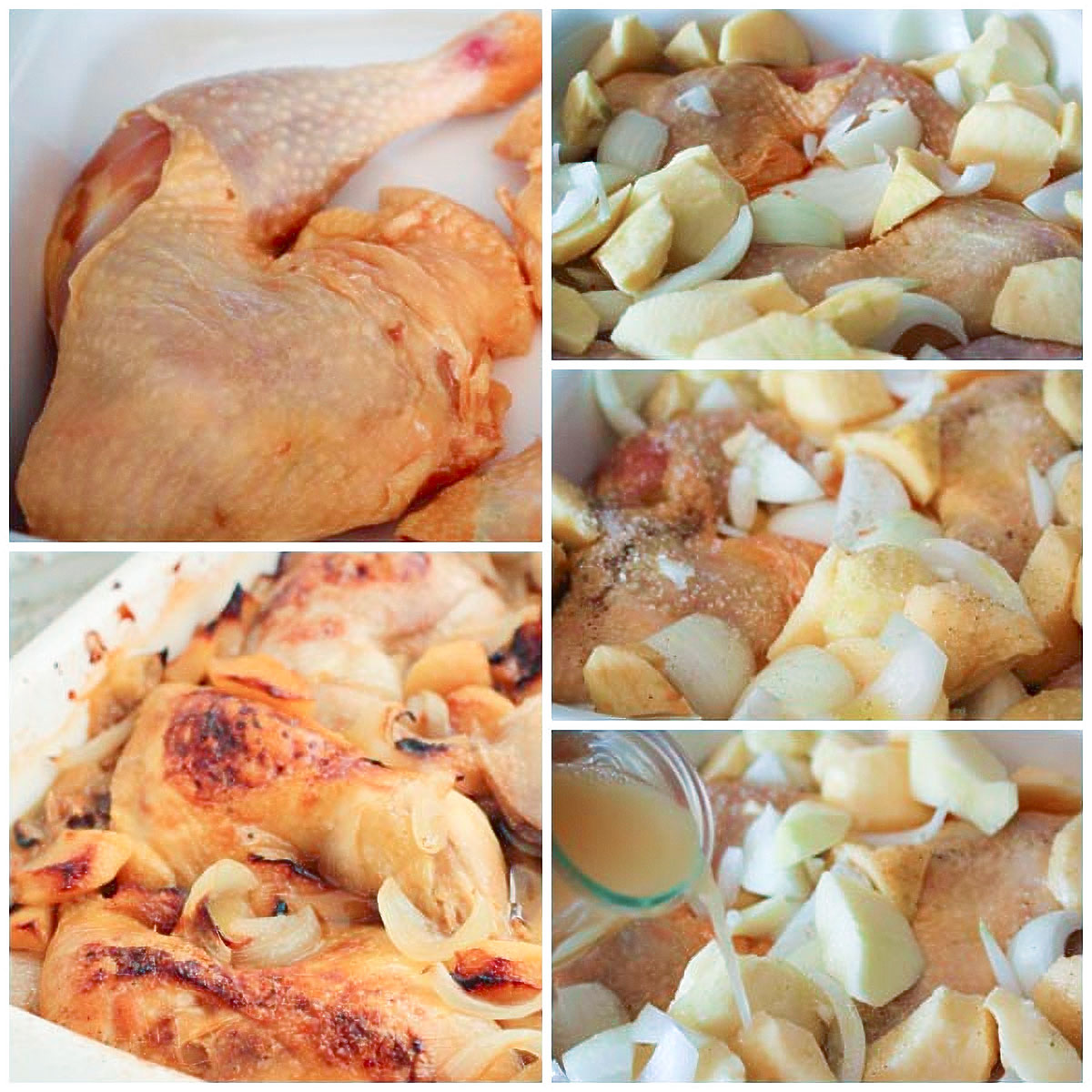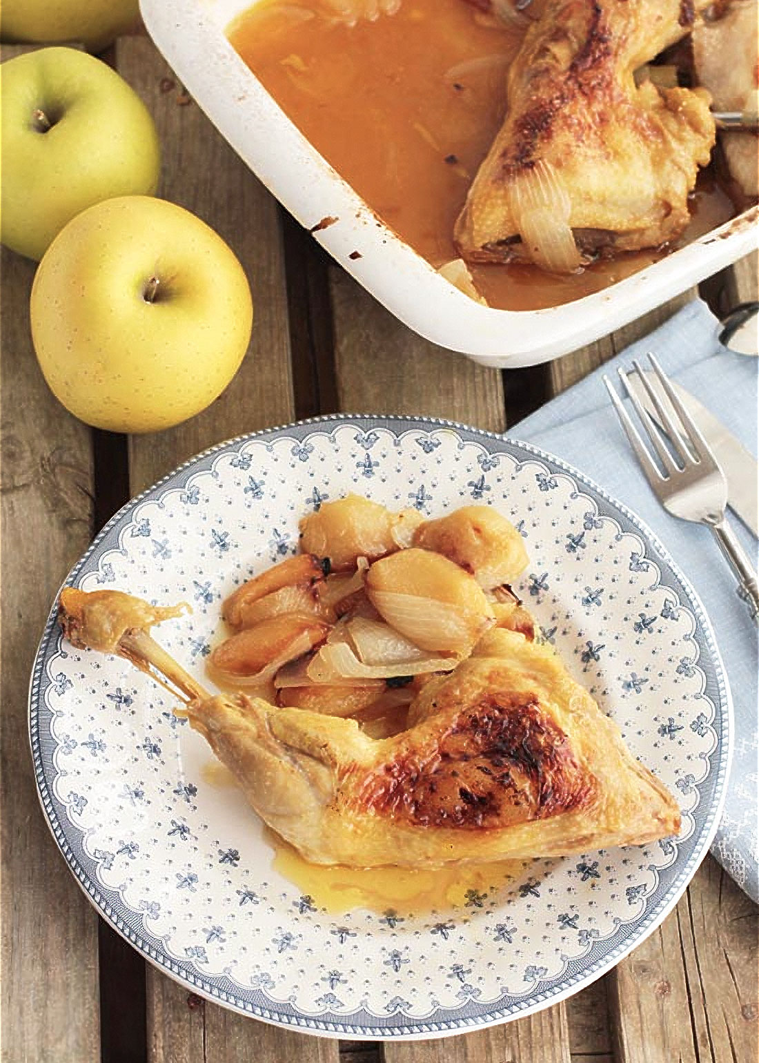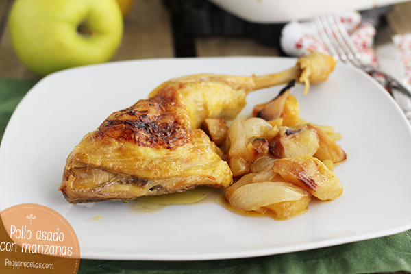 Hoy os traemos una receta deliciosa de pollo asado con manzanas, unos jugosos contramuslos de pollo asados en el horno con cebolla, manzanas y zumo de manzana… ¡riquísimo!