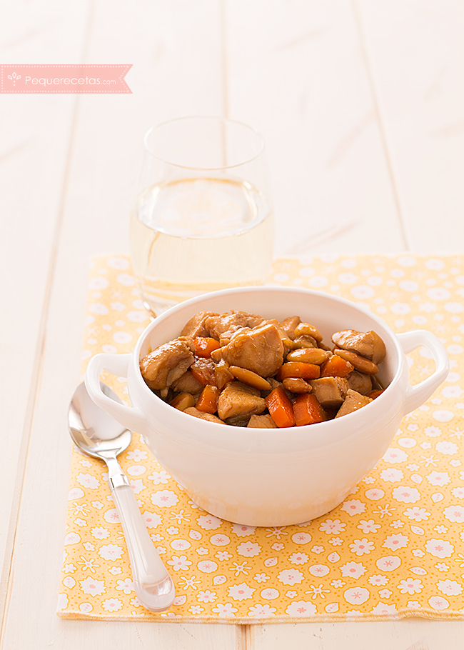 - Retiramos parte de la salsa de soja y freímos el pollo, añadimos las verduras y las almendras, cubrimos todo con caldo de pollo y dejamos cocinar durante 15 minutos.