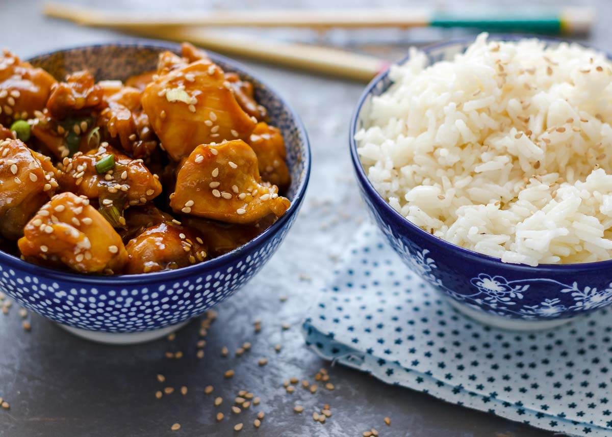 Servimos el pollo en cuencos, espolvoreando sésamo tostado por encima. Lo ideal en este caso es acompañarlo con arroz blanco, que puede ser de tipo Basmati, arroz salvaje o la variedad que más nos guste. Nosotros preferimos servirlo en cuencos aparte, para que cada uno se sirva a su gusto, pero otra opción es preparar una cama de arroz y poner el pollo con la salsa teriyaki por encima.