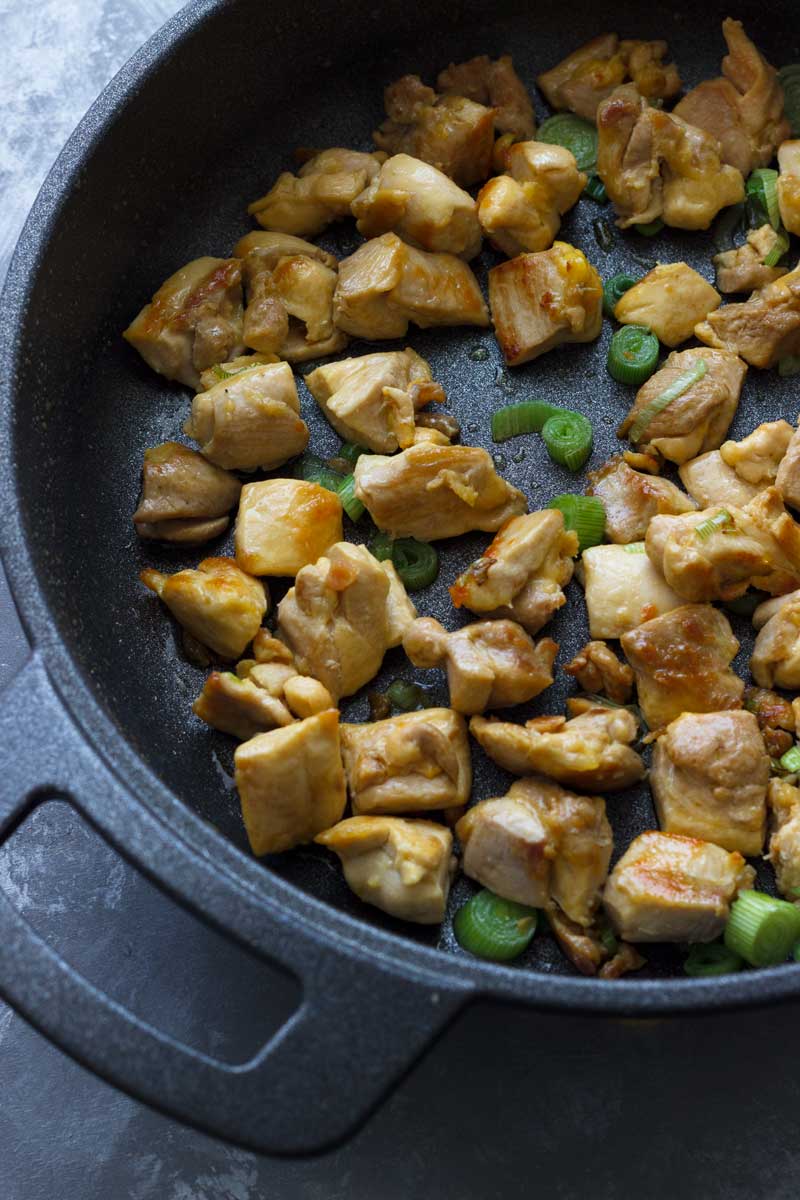 Lo ideal en este caso es utilizar contramuslos deshuesados de pollo, ya que aunque también se puede preparar esta receta con pechuga de pollo y otras piezas, lo ideal es que sean tamaños de un bocado y los contramuslos tienen la jugosidad necesaria para esta receta. Es importante como ya os apuntábamos arriba que los cortéis en trozos de un bocado, no demasiado pequeños para que no queden secos, pero todos con un tamaño similar para que se hagan al mismo tiempo.