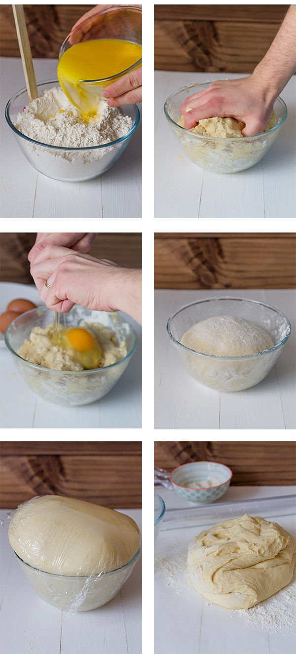 - Amasamos durante 10 minutos hasta conseguir una masa suave, elástica y sin grumos, dejamos reposar hasta que doble su volumen cubierta con papel film.