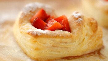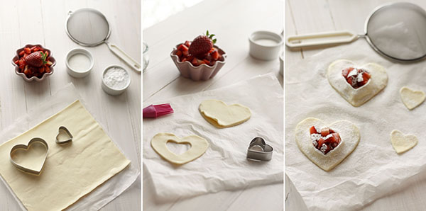 Con hojaldre, fresas y azúcar podemos preparar unas deliciosas y muy sencillas tartaletas de fresas. Necesitaremos cortadores en forma de corazón de dos tamaños, como por ejemplo estos. Aquí tenéis la receta: