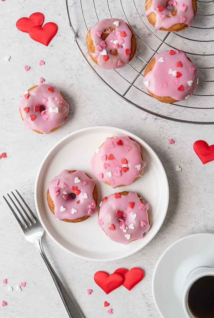El glaseado rosa, con unos sprinkles en forma de corazón (puedes comprarlos aquí) los convertirán en un perfecto postre de San Valentín. Aquí os explicamos cómo hacer glaseado para donuts: