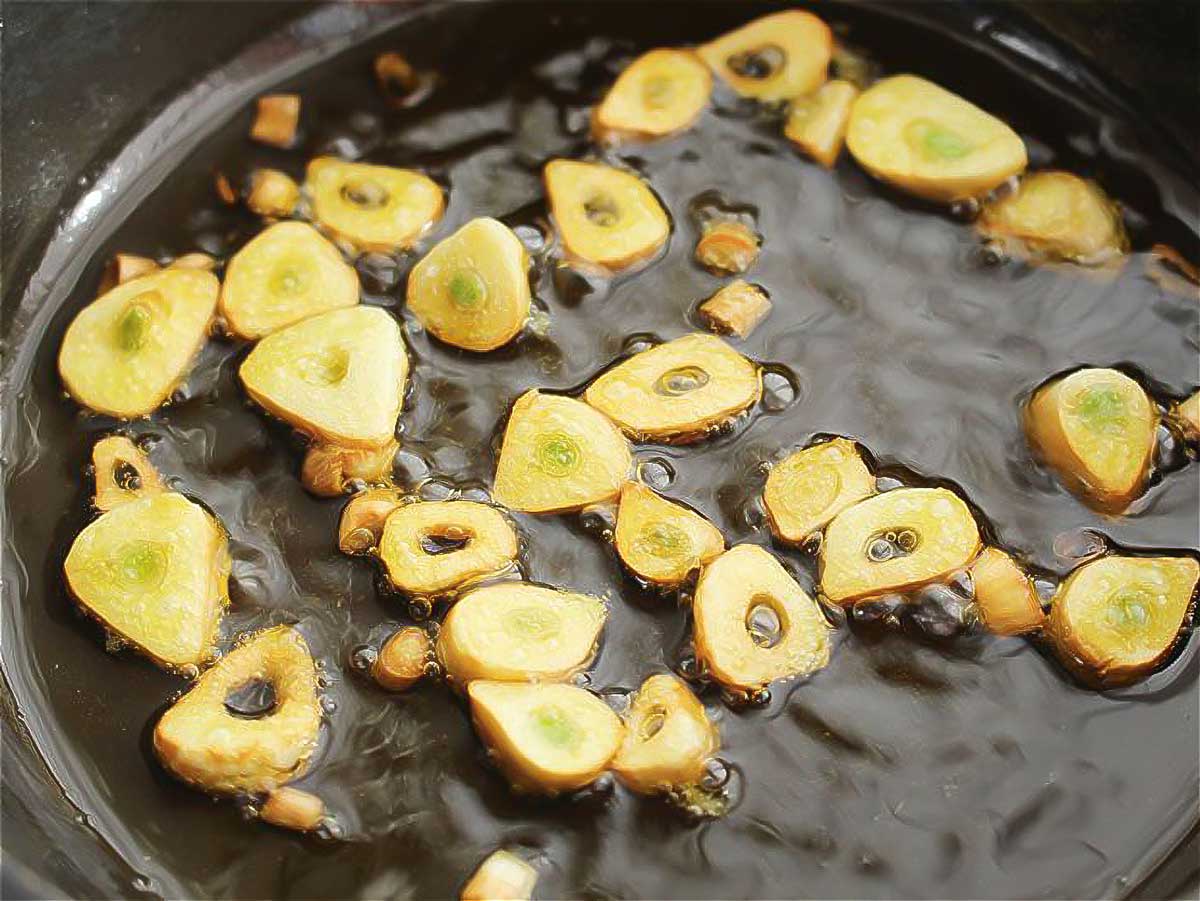 Dejamos a fuego medio y cuando empiecen a coger color echamos los ajos en el vaso de una batidora, dejando el aceite en la sartén.
