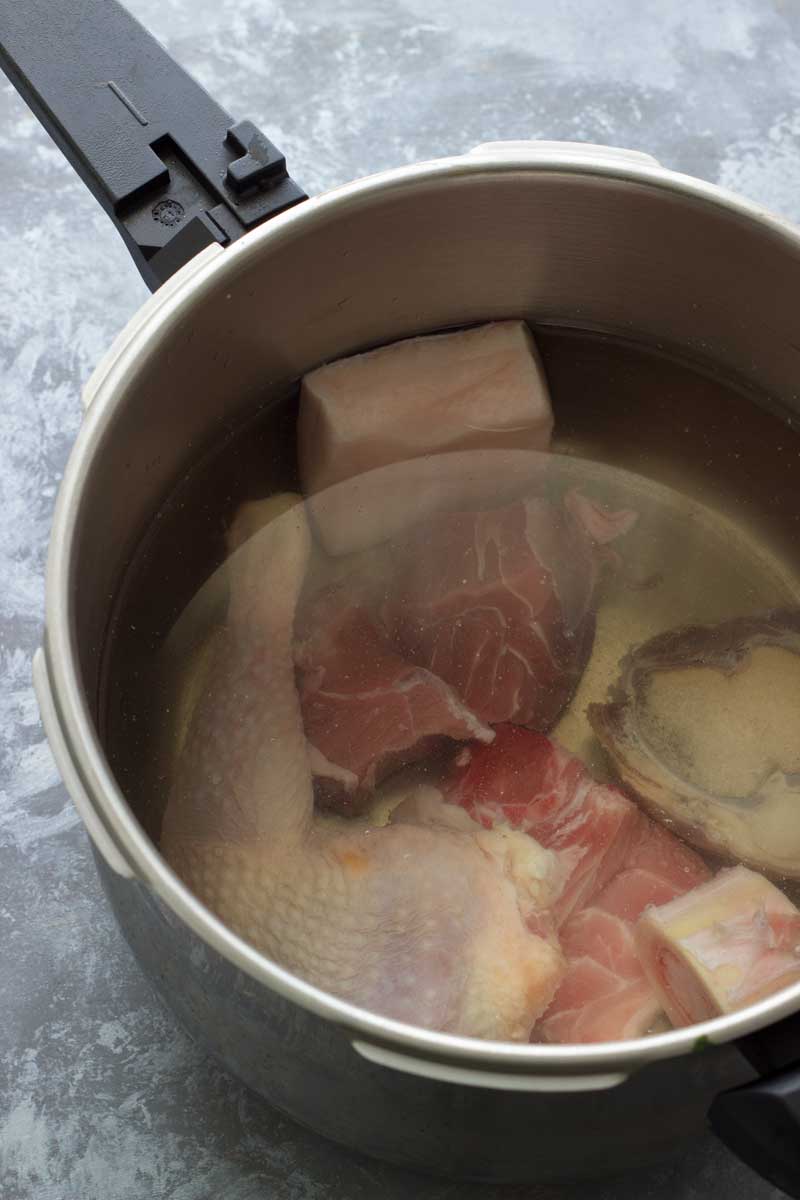 Perfecta la receta. Yo solo aportaría que si después de hacerlo en la olla express, necesitasen las carnes algo más de cocción, se saque el pollo y el tocino, si ya están blandos,para que no se deshagan y estropeen el caldo.